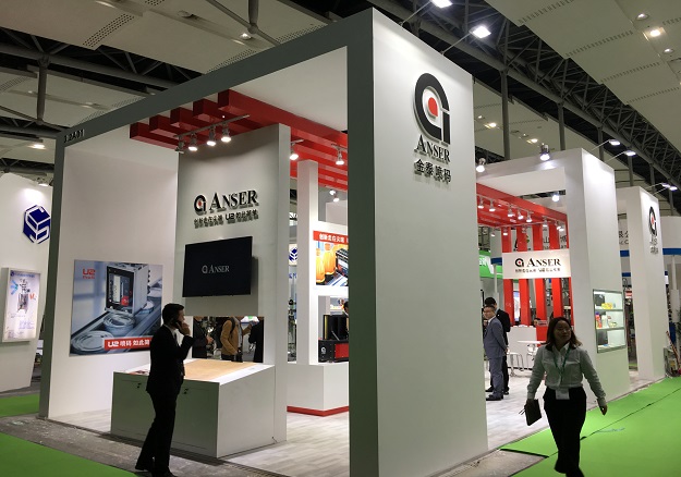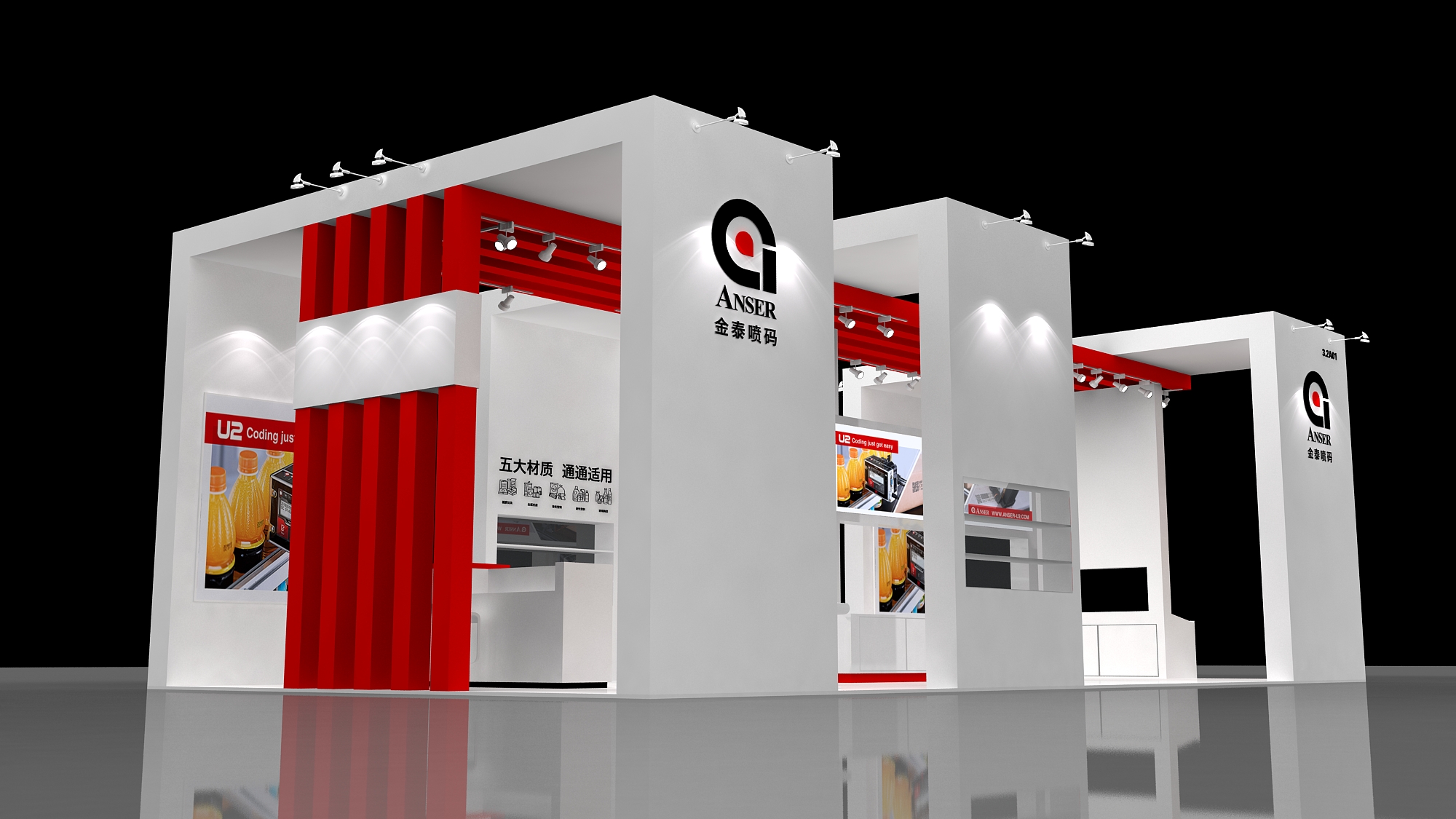 契合金泰噴碼品牌形象和產(chǎn)品特性,采用開放式的效果,再搭配燈具燈光的效果,襯托出展位現(xiàn)代、突出一種現(xiàn)代、高端的時尚品味。