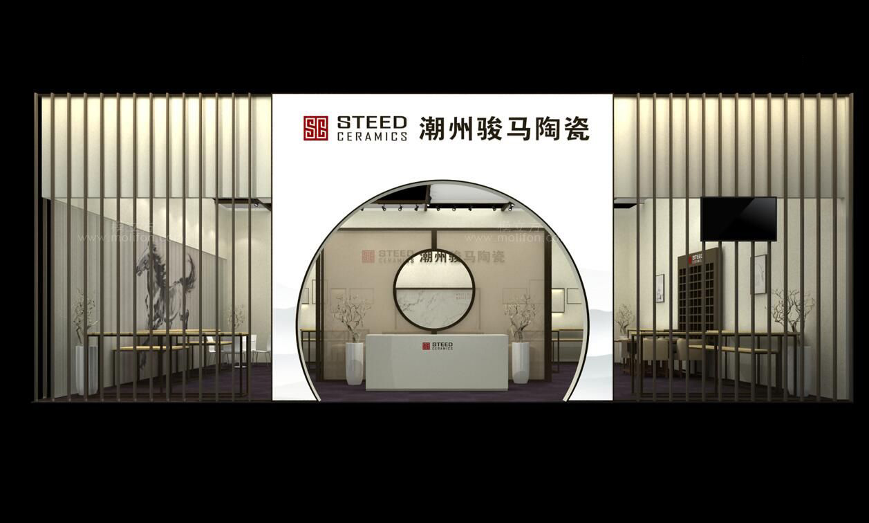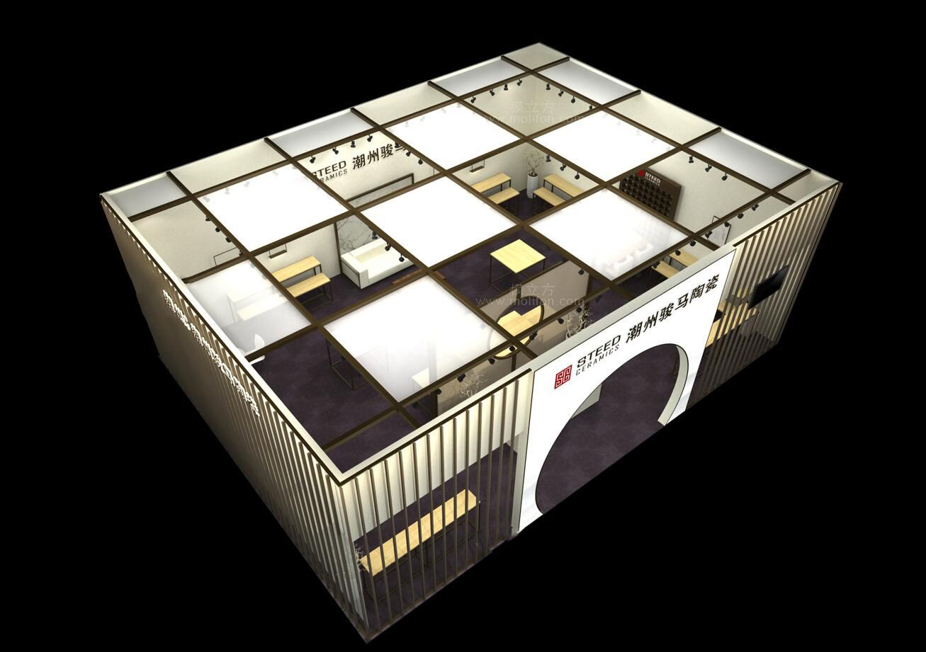 契合駿馬陶瓷的品牌形象和產(chǎn)品特性,采用矩形結(jié)構(gòu),再搭配燈具燈光的效果,襯托出展位大氣、豪華的氛圍,突出一種簡約、時尚的品味。