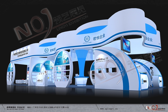 契合君恒的品牌形象和產(chǎn)品特性,采用弧形、矩形結(jié)構(gòu),再搭配燈具燈光的效果,襯托出展位時(shí)尚、簡(jiǎn)約的氛圍,突出一種柔順、活力的時(shí)尚品味。