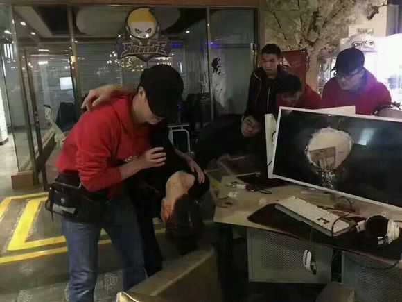 圖片很明顯看到,有一位小伙子的頭部穿過了屏幕,卡在顯示屏中部。而后網(wǎng)咖工作人員對其進(jìn)行急救。