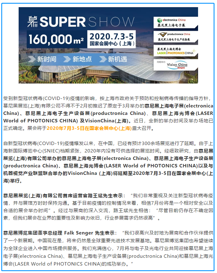 根據(jù)上海展會(huì)設(shè)計(jì)搭建公司領(lǐng)藝展覽了解到慕尼黑上海光博會(huì)(LASER World of PHOTONICS CHINA) 及VisionChina(上海)。近日,全新的舉辦時(shí)間及舉辦場(chǎng)地已正式確定。展會(huì)將于2020年7月3-5日在國(guó)家會(huì)展中心(上海)盛大召開(kāi)。如需上海展會(huì)設(shè)計(jì)請(qǐng)聯(lián)系領(lǐng)藝展覽,希望我們能在上海展會(huì)搭建上為您添磚加瓦,祝各位朋友收獲多多,滿載而歸!