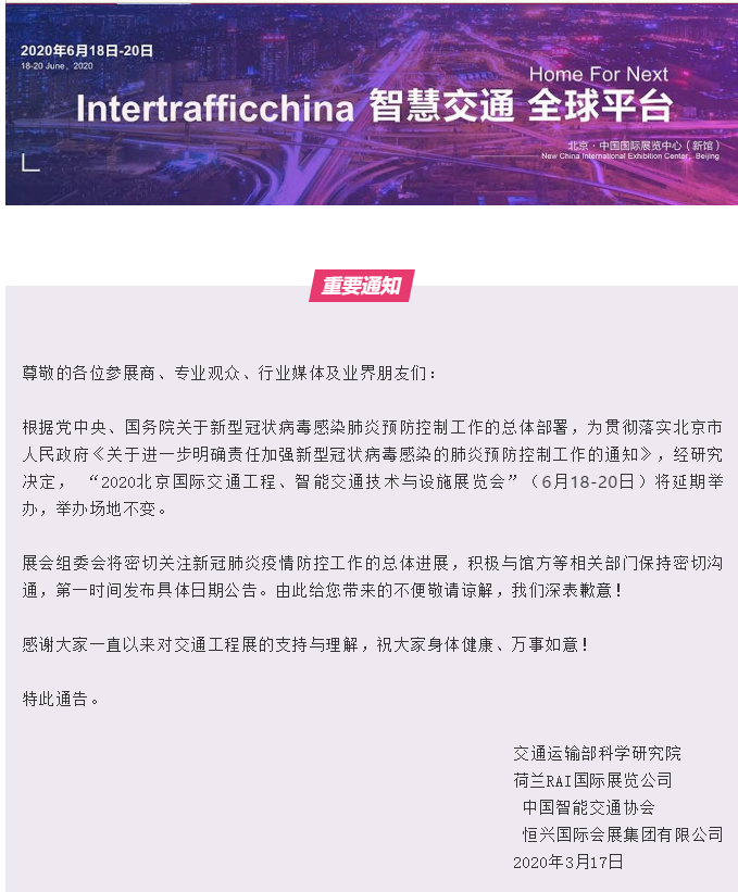 根據(jù)亞洲智能交通展設(shè)計(jì)搭建公司領(lǐng)藝展覽了解到,2020北京國際交通工程、智能交通技術(shù)與設(shè)施展覽會(huì)”(6月18-20日)將延期舉辦,舉辦場(chǎng)地不變。如需亞洲智能交通展設(shè)計(jì)請(qǐng)聯(lián)系領(lǐng)藝展覽,希望我們能在亞洲智能交通展搭建上為您添磚加瓦,祝各位朋友收獲多多,滿載而歸!