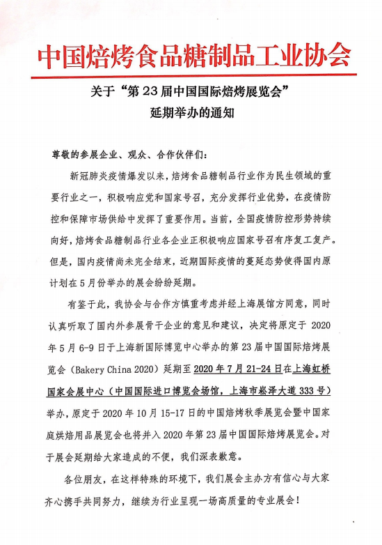 根據烘焙展設計搭建公司領藝展覽了解到,第23屆中國國際焙烤展覽會(原定于2020年5月6-9日于上海新國際博覽中心舉辦)將延期至2020年7月21-24日在上海虹橋國家會展中心(中國國際進口博覽會場館,上海市崧澤大道333號)舉辦。如需烘焙展設計請聯系領藝展覽,希望我們能在烘焙展搭建上為您添磚加瓦,祝各位朋友收獲多多,滿載而歸!