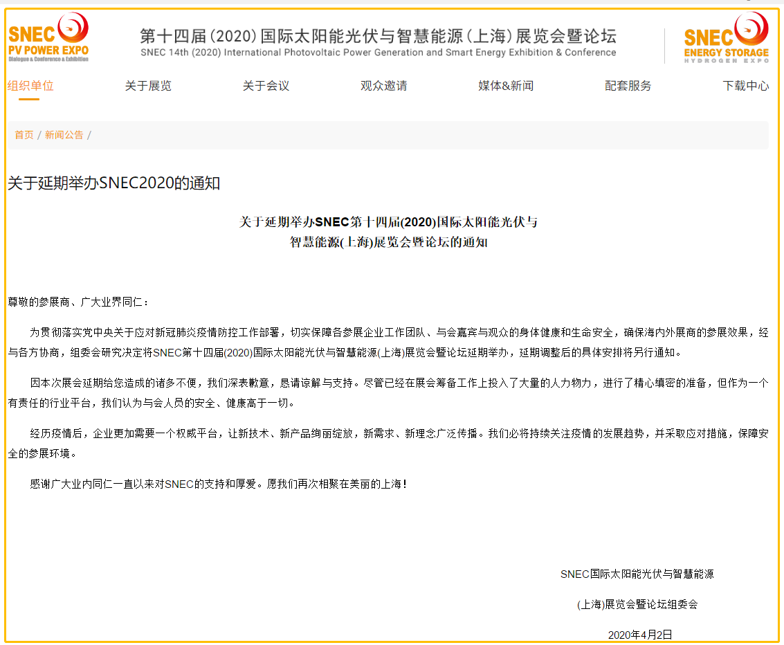 根據(jù)光伏展設(shè)計(jì)搭建公司領(lǐng)藝展覽了解到,為貫徹落實(shí)黨中央關(guān)于應(yīng)對(duì)新冠肺炎疫情防控工作部署,切實(shí)保障各參展企業(yè)工作團(tuán)隊(duì)、與會(huì)嘉賓與觀眾的身體健康和生命安全,確保海內(nèi)外展商的參展效果,經(jīng)與各方協(xié)商,組委會(huì)研究決定將SNEC第十四屆(2020)國(guó)際太陽(yáng)能光伏與智慧能源(上海)展覽會(huì)暨論壇延期舉辦,延期調(diào)整后的具體安排將另行通知。如需光伏展設(shè)計(jì)請(qǐng)聯(lián)系領(lǐng)藝展覽,希望我們能在光伏展搭建上為您添磚加瓦,祝各位朋友收獲多多,滿載而歸!
