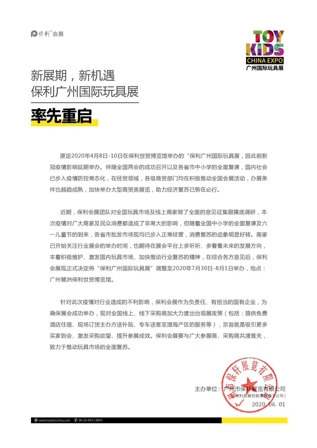 廣州玩具展設計搭建公司領(lǐng)藝展覽了解到,原定于2020年4月8日舉行的“保利廣州國際玩具展”調(diào)整至2020年7月30日-8月1日舉行。如需廣州玩具展設計請聯(lián)系領(lǐng)藝展覽,希望我們能在廣州玩具展搭建上為您添磚加瓦,祝各位朋友收獲多多,滿載而歸!