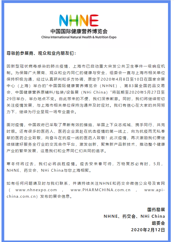 關(guān)于“NHNE、83屆藥交會(huì)、NHi”改期舉辦的通知-上海健康展設(shè)計(jì)搭建