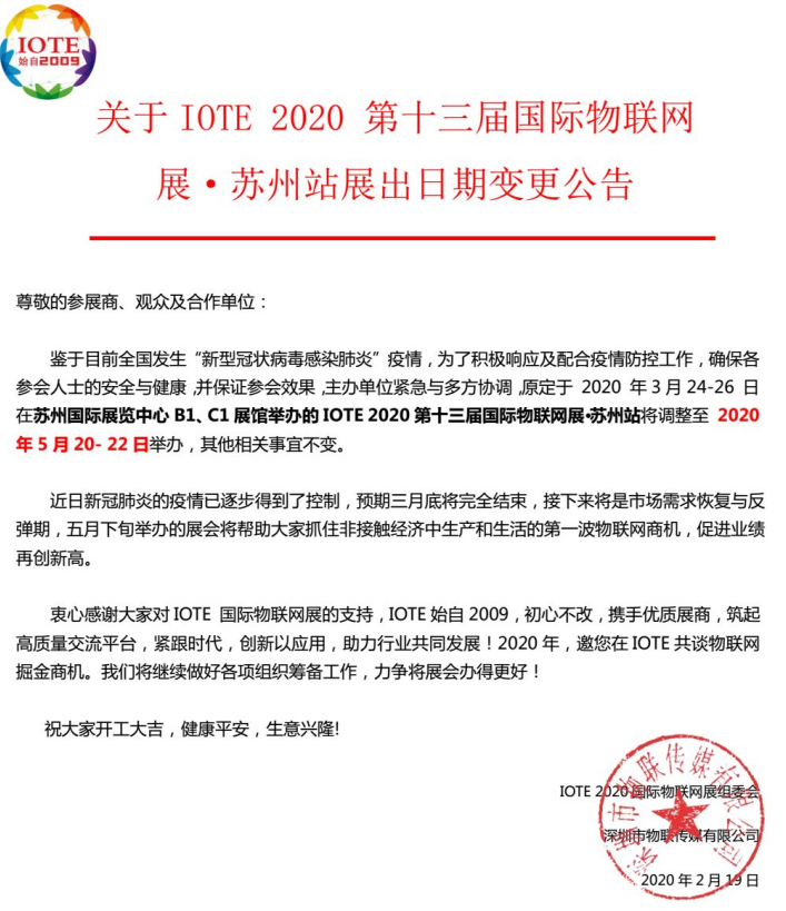 根據IOTE物聯網展設計搭建公司領藝展覽解到,鑒于目前全國發(fā)生“新型冠狀病毒感染肺炎”疫情,按照蘇州市人民政府《關于減少和取消大型公眾聚集性活動的通告》要求,即日起,按照“非必須、不舉辦”的原則,在全市減少和取消大型公眾聚集性活動。全力做好新型冠狀病毒感染肺炎疫情防控工作,為了響應及配合疫情防控工作,確保各參展商及觀眾的健康安全,組委會決定將原定于2020年3月24-26日在蘇州國際展覽中心B1、C1展館舉辦的IOTE 2020第十三屆國際物聯網展·蘇州站將延期至5月20-22日舉辦。如需IOTE物聯網展設計請聯系領藝展覽,希望我們能在IOTE物聯網展搭建上為您添磚加瓦,祝各位朋友收獲多多,滿載而歸!