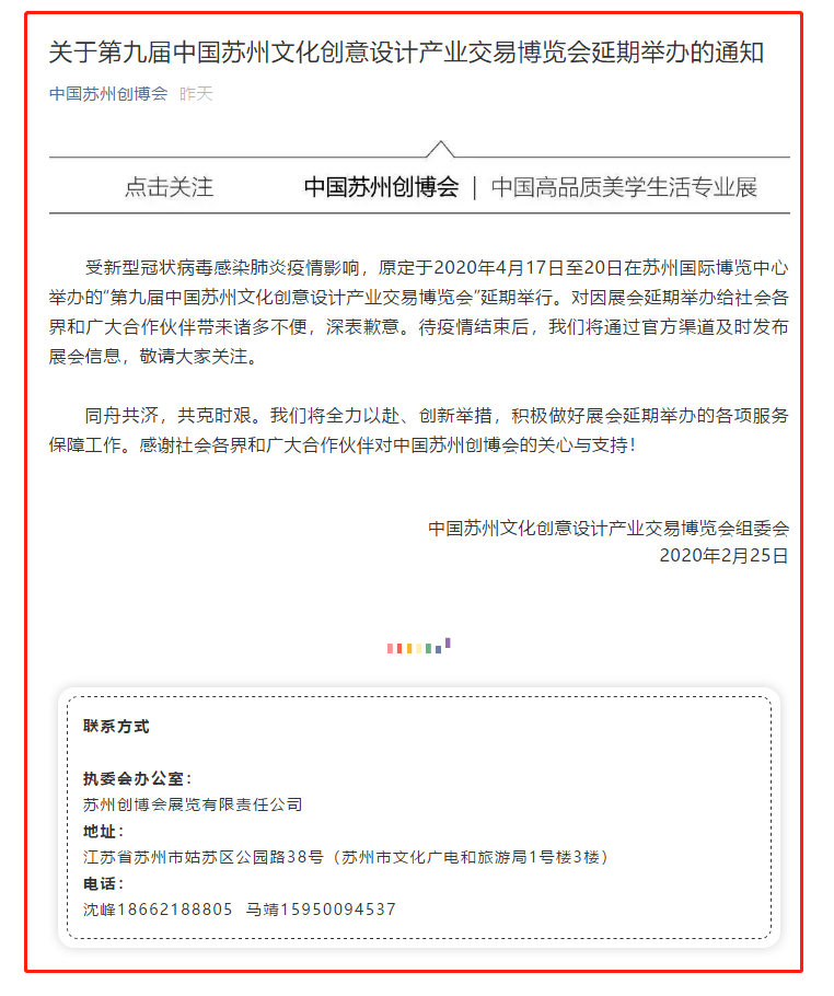 根據(jù)蘇州創(chuàng)博會(huì)設(shè)計(jì)搭建公司領(lǐng)藝展覽了解到,受新型冠狀病毒感染肺炎疫情影響,原定于2020年4月17日至20日在蘇州國(guó)際博覽中心舉辦的“第九屆中國(guó)蘇州文化創(chuàng)意設(shè)計(jì)產(chǎn)業(yè)交易博覽會(huì)”延期舉行。如需創(chuàng)博會(huì)設(shè)計(jì)請(qǐng)聯(lián)系領(lǐng)藝展覽,希望我們能在蘇州創(chuàng)博會(huì)搭建上為您添磚加瓦,祝各位朋友收獲多多,滿載而歸!