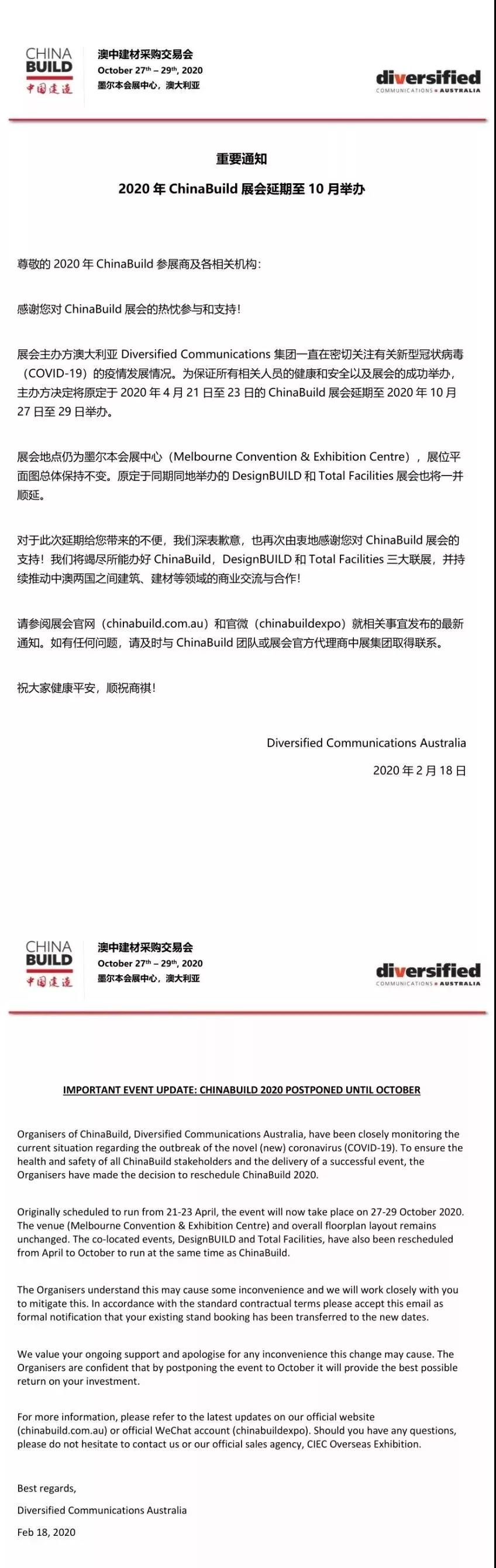 根據建材展設計搭建公司領藝展覽了解到,為做好新冠肺炎疫情防控工作,切實保障參展商、觀眾及所有相關工作人員身體健康和生命安全,保證展會效果,經研究決定,現將 2020年China Build展會舉辦時間延期至10月27日-29日,舉辦地點不變(墨爾本會展中心)。如需建材展設計請聯系領藝展覽,希望我們能在建材展搭建上為您添磚加瓦,祝各位朋友收獲多多,滿載而歸!