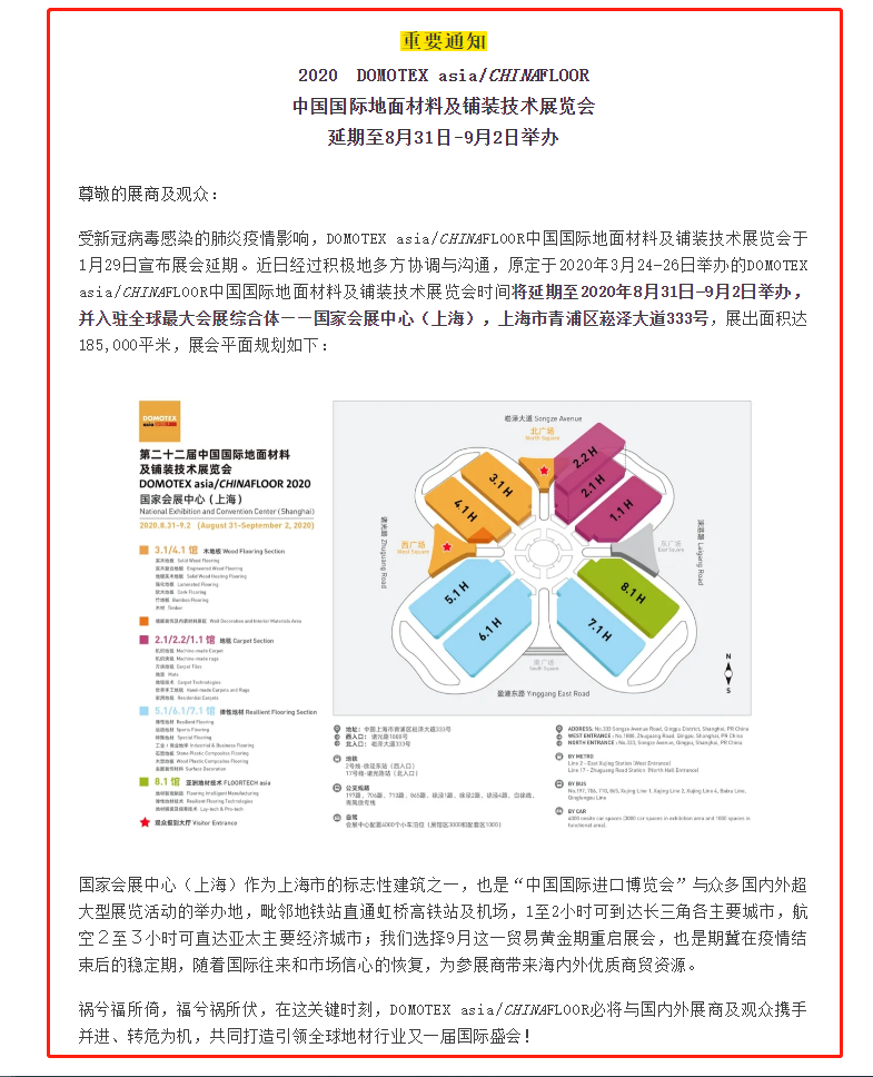 根據(jù)地材展設(shè)計搭建公司領(lǐng)藝展覽了解到,受新冠病毒感染的肺炎疫情影響,DOMOTEX asia/CHINAFLOOR中國國際地面材料及鋪裝技術(shù)展覽會于1月29日宣布展會延期。近日經(jīng)過積極地多方協(xié)調(diào)與溝通,原定于2020年3月24-26日舉辦的DOMOTEX asia/CHINAFLOOR中國國際地面材料及鋪裝技術(shù)展覽會時間將延期至2020年8月31日-9月2日舉辦,并入駐全球最大會展綜合體——國家會展中心(上海),上海市青浦區(qū)崧澤大道333號。如需地材展設(shè)計請聯(lián)系領(lǐng)藝展覽,希望我們能在地材展搭建上為您添磚加瓦,祝各位朋友收獲多多,滿載而歸!