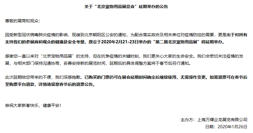 根據(jù)北京寵物展設(shè)計(jì)搭建公司領(lǐng)藝展覽了解到,因受新型冠狀病毒肺炎疫情的影響,主辦方為配合落實(shí)政府及相關(guān)單位對(duì)疫情防控的需要,更是出于對(duì)所有支持我們的參展商和觀(guān)眾的健康及安全考量,原定于2020年2月21-23日舉辦的“第二屆北京寵物用品展”將延期舉辦。如需北京寵物展設(shè)計(jì)請(qǐng)聯(lián)系領(lǐng)藝展覽,希望我們能在北京寵物展搭建上為您添磚加瓦,祝各位朋友收獲多多,滿(mǎn)載而歸!