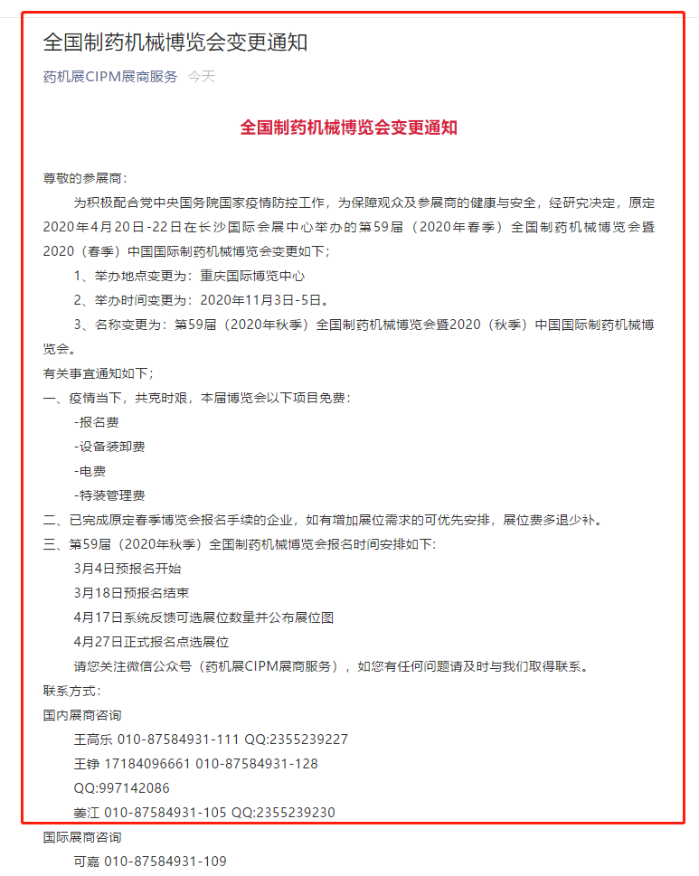 根據(jù)藥機展設計搭建公司領藝展覽了解到,為積極配合黨中央國務院國家疫情防控工作,為保障觀眾及參展商的健康與安全,經(jīng)研究決定,原定2020年4月20日-22日在長沙國際會展中心舉辦的第59屆(2020年春季)全國制藥機械博覽會暨2020(春季)中國國際制藥機械博覽會變更。如需藥機展設計請聯(lián)系領藝展覽,希望我們能在藥機展搭建上為您添磚加瓦,祝各位朋友收獲多多,滿載而歸!