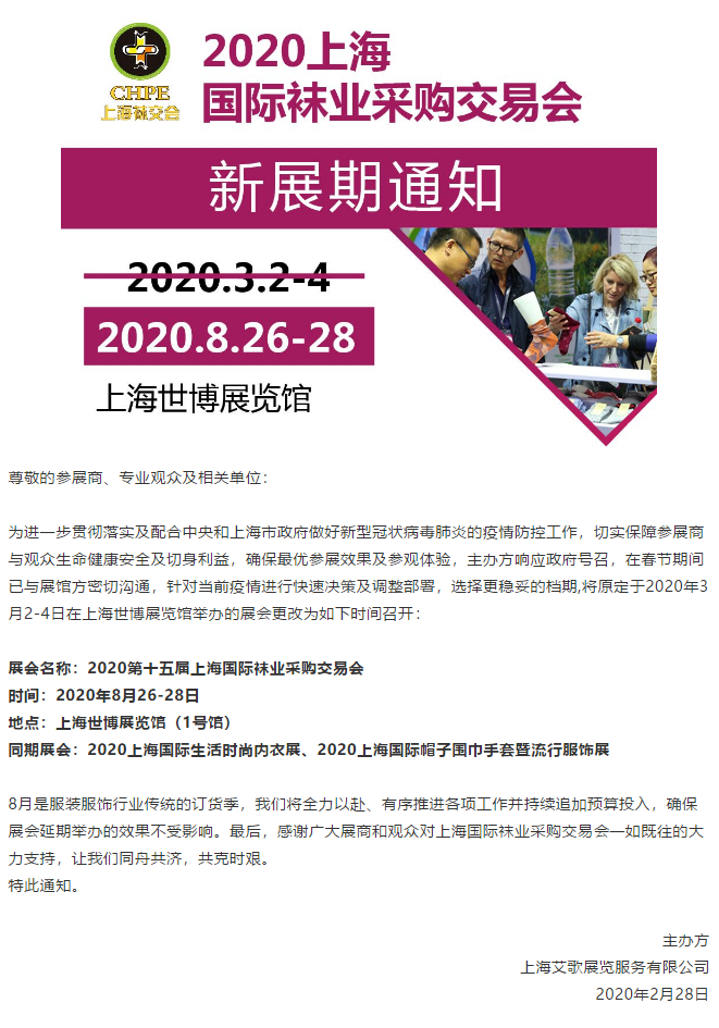 根據(jù)襪交會展臺設(shè)計公司領(lǐng)藝展覽了解到,為進一步貫徹落實及配合中央和上海市政府做好新型冠狀病毒肺炎的疫情防控工作,切實保障參展商與觀眾生命健康安全及切身利益,確保最優(yōu)參展效果及參觀體驗,主辦方響應(yīng)政府號召,在春節(jié)期間已與展館方密切溝通,針對當(dāng)前疫情進行快速決策及調(diào)整部署,選擇更穩(wěn)妥的檔期,將原定于2020年3月2-4日在上海世博展覽館舉辦的展會更改為8月26-28日召開,如需襪交會展位設(shè)計裝修請聯(lián)系領(lǐng)藝展覽,希望我們能在襪交會布展搭建上為您添磚加瓦,祝各位朋友收獲多多,滿載而歸!
