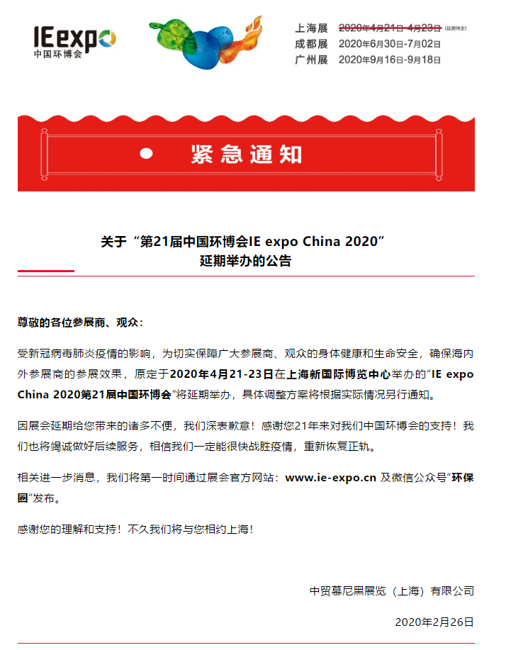 根據(jù)環(huán)博會設計搭建公司領藝展覽了解到,受新冠病毒肺炎疫情的影響,為切實保障廣大參展商、觀眾的身體健康和生命安全,確保海內(nèi)外參展商的參展效果,原定于2020年4月21-23日在上海新國際博覽中心舉辦的“IE expo China 2020第21屆中國環(huán)博會”將延期舉辦,具體調(diào)整方案將根據(jù)實際情況另行通知。相信我們一定能很快戰(zhàn)勝疫情,重新恢復正軌。相關進一步消息,主辦將第一時間通過展會官方網(wǎng)站:www.ie-expo.cn 及微信公眾號“環(huán)保圈”發(fā)布。如需環(huán)博會設計請聯(lián)系領藝展覽,希望我們能在環(huán)博會搭建上為您添磚加瓦,祝各位朋友收獲多多,滿載而歸!