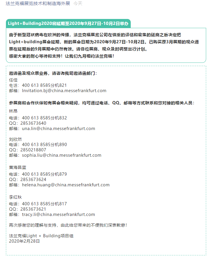 根據(jù)照明展展臺設(shè)計(jì)公司領(lǐng)藝展覽了解到,由于新型冠狀病毒在歐洲的傳播,法蘭克福展覽公司在慎重的評估和密集的磋商之后決定把Light+building展會延期,新的展會日期為2020年9月27日-10月2日。已購買原3月展期的觀眾通票在延期后的9月展期中仍然有效。請各位展商、觀眾及時(shí)調(diào)整出行計(jì)劃。感謝大家的耐心等待和支持!讓我們九月相約法蘭克福!如需照明展展位設(shè)計(jì)裝修請聯(lián)系領(lǐng)藝展覽,希望我們能在照明展布展搭建上為您添磚加瓦,祝各位朋友收獲多多,滿載而歸!