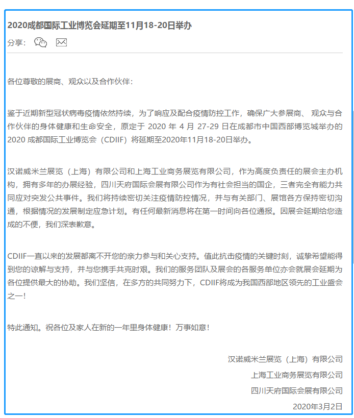 根據(jù)工博會設(shè)計搭建公司領(lǐng)藝展覽了解到,原定于 2020 年 4 月 27-29 日在成都市中國西部博覽城舉辦的2020 成都國際工業(yè)博覽會(CDIIF)將延期至2020年11月18-20日舉辦。 如需工博會展臺設(shè)計請聯(lián)系領(lǐng)藝展覽,希望我們能在工博會展臺搭建上為您添磚加瓦,祝各位朋友收獲多多,滿載而歸!
