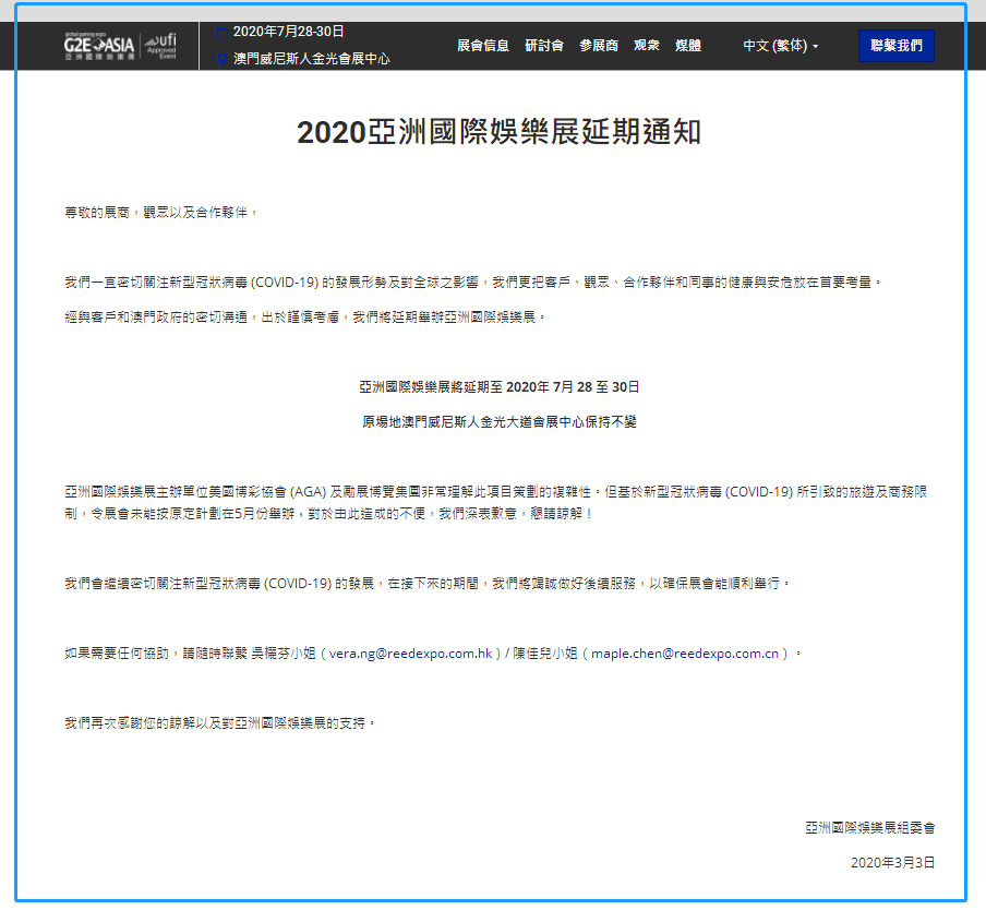 根據(jù)娛樂(lè)展設(shè)計(jì)搭建公司領(lǐng)藝展覽了解到,受新冠肺炎疫情的影響。亞洲國(guó)際娛樂(lè)展將延期至 2020年 7月 28 至 30日,原場(chǎng)地澳門威尼斯人金光大道會(huì)展中心保持不變。如需娛樂(lè)展設(shè)計(jì)請(qǐng)聯(lián)系領(lǐng)藝展覽,希望我們能在澳門展臺(tái)展搭建上為您添磚加瓦,祝各位朋友收獲多多,滿載而歸!