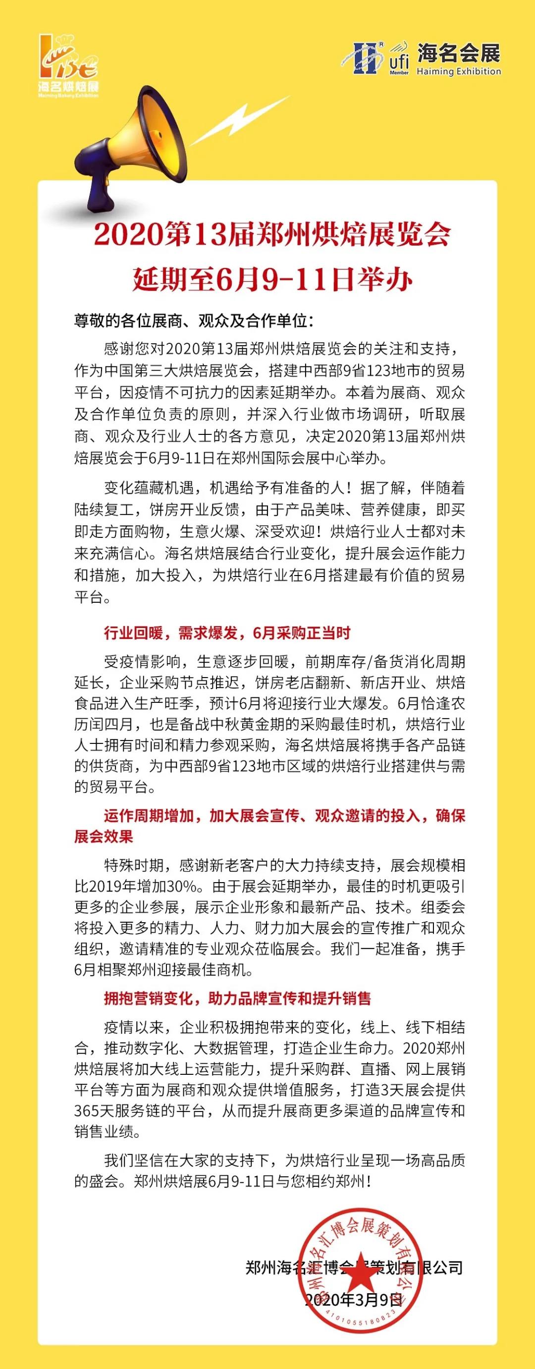 根據(jù)烘培展展臺(tái)設(shè)計(jì)搭建公司領(lǐng)藝展覽了解到,2020第13屆鄭州烘焙展覽會(huì)延期至6月9-11日舉辦。如需烘焙展展臺(tái)設(shè)計(jì)請(qǐng)聯(lián)系領(lǐng)藝展覽,希望我們能在烘焙展展臺(tái)搭建上為您添磚加瓦,祝各位朋友收獲多多,滿載而歸!