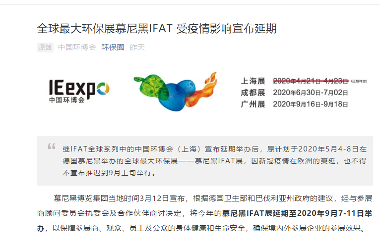 根據(jù)環(huán)保展設計搭建公司領藝展覽了解到,慕尼黑博覽集團當?shù)貢r間3月12日宣布,根據(jù)德國衛(wèi)生部和巴伐利亞州政府的建議,經(jīng)與參展商顧問委員會執(zhí)委會及合作伙伴商討決定,將今年的慕尼黑IFAT展延期至2020年9月7-11日舉辦,以保障參展商、觀眾、員工及公眾的身體健康和生命安全,確保境內(nèi)外參展企業(yè)的參展效果。如需環(huán)保展設計請聯(lián)系領藝展覽,希望我們能在環(huán)保展搭建上為您添磚加瓦,祝各位朋友收獲多多,滿載而歸!