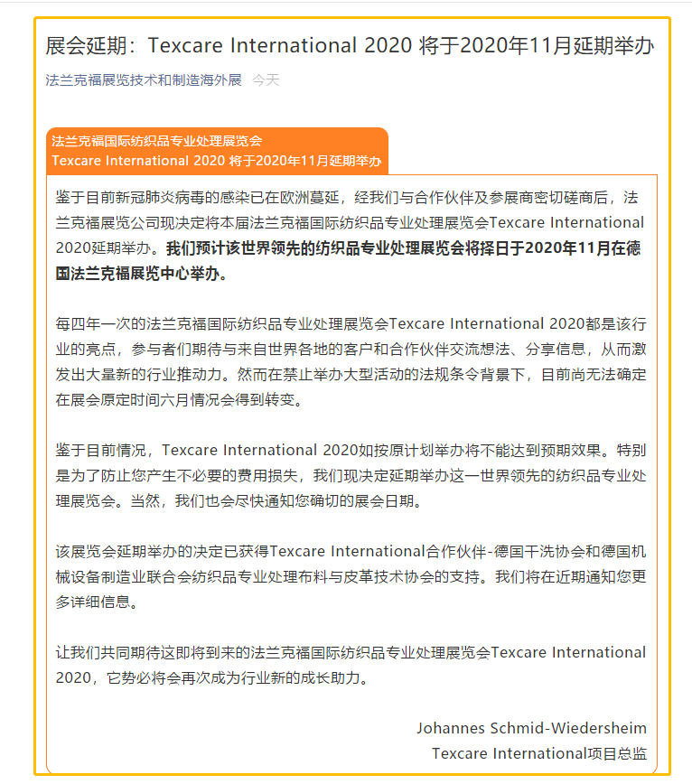 根據(jù)紡織展展會設(shè)計搭建公司領(lǐng)藝展覽了解到,鑒于目前新冠肺炎病毒的感染已在歐洲蔓延,經(jīng)我們與合作伙伴及參展商密切磋商后,法蘭克福展覽公司現(xiàn)決定將本屆法蘭克福國際紡織品專業(yè)處理展覽會Texcare International 2020延期舉辦。我們預(yù)計該世界領(lǐng)先的紡織品專業(yè)處理展覽會將擇日于2020年11月在德國法蘭克福展覽中心舉辦。如需紡織展設(shè)計請聯(lián)系領(lǐng)藝展覽,希望我們能在紡織展搭建上為您添磚加瓦,祝各位朋友收獲多多,滿載而歸!