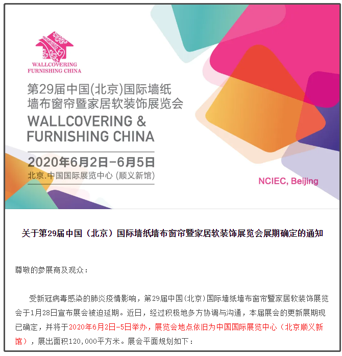根據(jù)北京展會設計搭建公司領藝展覽了解到,受新冠病毒感染的肺炎疫情影響,第29屆中國(北京)國際墻紙墻布窗簾暨家居軟裝飾展覽會于1月28日宣布展會被迫延期。近日,經(jīng)過積極地多方協(xié)調與溝通,本屆展會的更新展期現(xiàn)已確定,并將于2020年6月2日-5日舉辦,展覽會地點依舊為中國國際展覽中心(北京順義新館),展出面積120,000平方米。如需北京展會設計請聯(lián)系領藝展覽,希望我們能在北京展會搭建上為您添磚加瓦,祝各位朋友收獲多多,滿載而歸!