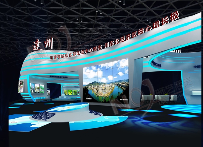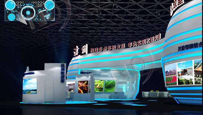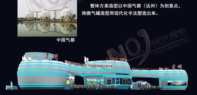 巧妙的運用白色、藍色作為搭配,著重突出達州“東大門”的特點,再搭配燈具燈光的效果,突出一種現(xiàn)代、高端的時尚品味,使整個展位主題鮮明又活力四射。